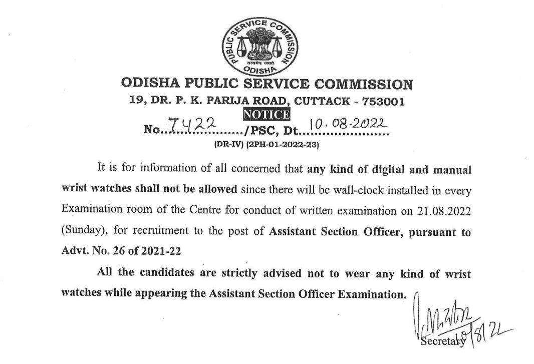 Bhubaneswar: The Odisha Public Service Commission (OPSC) has announced that the candidates for the written test for appointment to the posts of Assistant Section Officer (ASO) will not be allowed to carry wrist watches inside the examination halls.