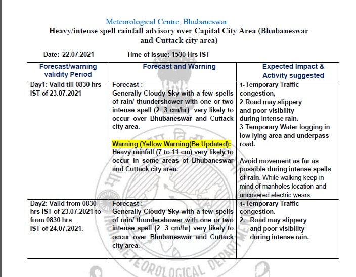 This weather condition will prevail in Cuttack (including Cuttack city, Khurda (including Bhubaneswar), Puri, Jagatsinghpur, Kendrapada and Mayurbhanj for the next three hours till 7.45 pm on Thursday.