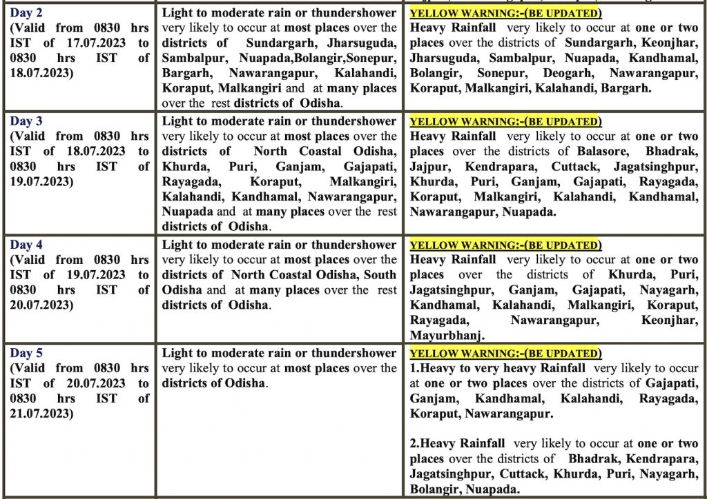 Yellow warning for heavy rainfall continues for some parts of coastal and southern districts of Odisha till July 19. Heavy to very heavy rain may occur again at one or two places in Gajapati, Ganjam, Kandhamal, Kalahandi, Rayagada, Koraput, Nabarangpur with heavy rain one or two places in Bhadrak, Kendrapara, Jagatsinghpur, Cuttack, Khurda, Puri, Nayagarh, Balangir, Nuapada on July 20.