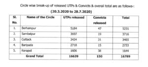 Bhubaneswar: The state government has released total 16,639 Under Trial Prisoners (UTPs) and 150 convicts during the period of March 20 to July 28 this year.