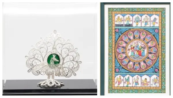 Among Odisha’s key highlights this year are Pattachitra artworks depicting tales of Lord Krishna, Radha, and Lord Ganesh, painted in natural colours on palm leaf or traditional media preserving centuries-old artistry, a Silver Peacock Memento highlighting the state’s mastery of filigree craft, combining elegance with national symbolism, and a Tussar Silk Painting of Navagunjara, capturing the mythical nine-element form of Lord Krishna, blending nature, mythology, and textile skill.