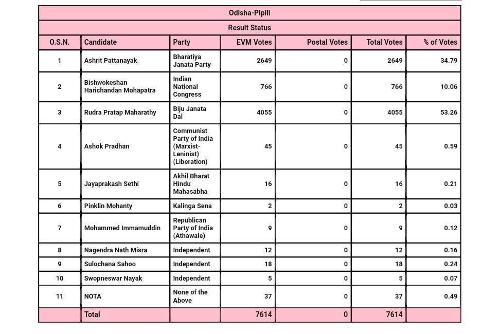 While Maharathy received 13611 votes, Pattanayak polled 8567 votes. Congress’ Bishwokeshan Harichandan Mohapatra got 1180 votes.
