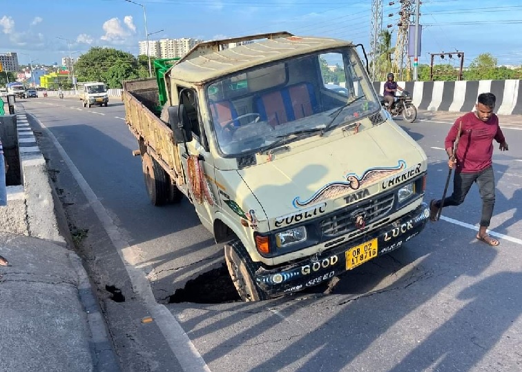 According to sources, the incident took place when the empty mini-truck was en route to Khurda in the afternoon. As the driver took the vehicle to the approach road to go to the flyover on the NH 16 near Aiginia, the road caved in.