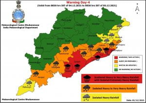 The IMD has said the intensity of rainfall in Odisha will increase from December 4, especially coastal and interior districts will experience heavy to very heavy rainfall. Some parts of coastal Odisha will experience extremely heavy rainfall (20 cm or above) during the period.