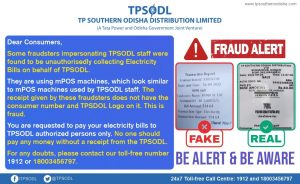 Berhampur: Tata Power Southern Odisha Distribution Limited (TPSODL) on Saturday issued an advisory against fraudsters, who were involved in unauthorised bill collection, by impersonating TPSODL staff.