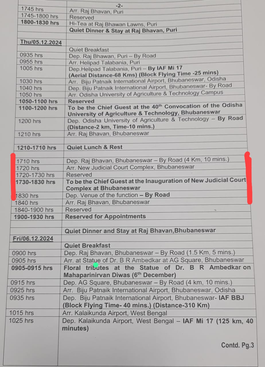 On December 6, Murmu will land at a temporary helipad at Rangamatia in Mayurbhanj in a special helicopter from Kolkata’s Defence Airbase and travel to tribal village of Uparbeda by road. She is scheduled to visit Uparbeda Government High School, where she did her schooling, and interact with students and teachers. She will then proceed to her residence at Rairangpur for lunch and inaugurate an ambulance at the local hospital.