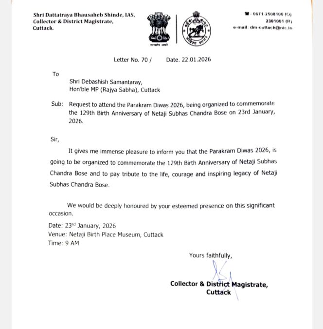Bhubaneswar: The Rajya Sabha Secretariat has issued a privilege notice to Cuttack District Collector Dattatraya Bhausaheb Shinde for allegedly not inviting Biju Janata Dal (BJD) MP Debashish Samanataray to Netaji Jayanti celebrations on January 23.