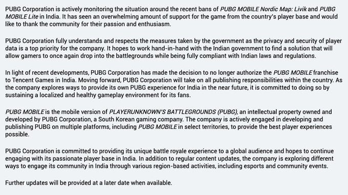 PUBG responded to the ban in its statement, “In light of recent developments, PUBG Corporation has made the decision to no longer authorise PUBG MOBILE franchise to Tencent Games in India. Moving forward, PUBG Corporation will take on all publishing responsibilities within the country. As the company explores ways to provide its own PUBG experience for India in the near future, it is committed to doing so by sustaining a localised and healthy gameplay environment for its fans.”