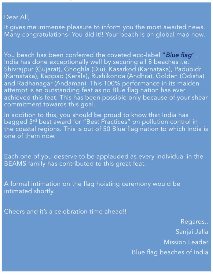 It is among the eight beaches of India to have got the coveted title on the first attempt and made it to the global map.