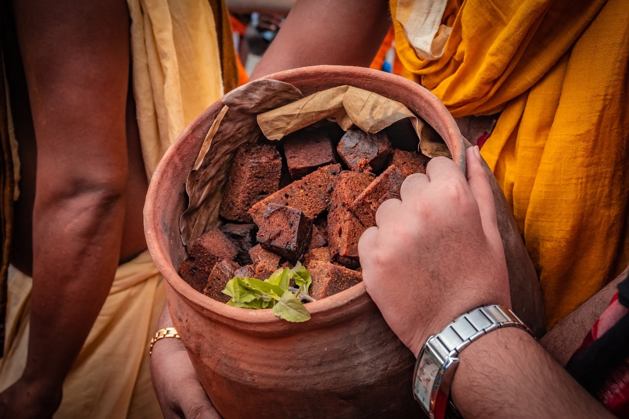 Poda Pitha is prepared under the supervision of Bishwanath Mishra, the chief servitor of the temple of Maa Ardhaswasini, known as deities’ aunt. The sweet dish is made from milk, chhena (cottage cheese), wheat flour, jaggery, cloves, ghee, and cardamom. The dough is then cut and fried in ghee.
