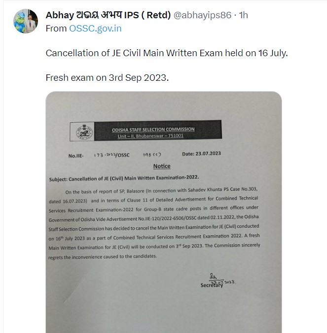 Abhay, Chairman of OSSC, in a tweet on Sunday, said, “The Commission has decided to cancel the Main Written Examination for JE (Civil) conducted on July 16, 2023 as a part of Combined Technical services Recruitment Examination 2022. Fresh main written examination for JE (Civil) will be conducted on September 3.”