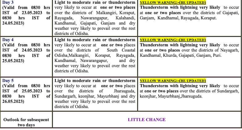Light to moderate rain or thunderstorm with lightning and gusty surface wind speed reaching 40-50 kmph is likely in Khurda and Puri districts.