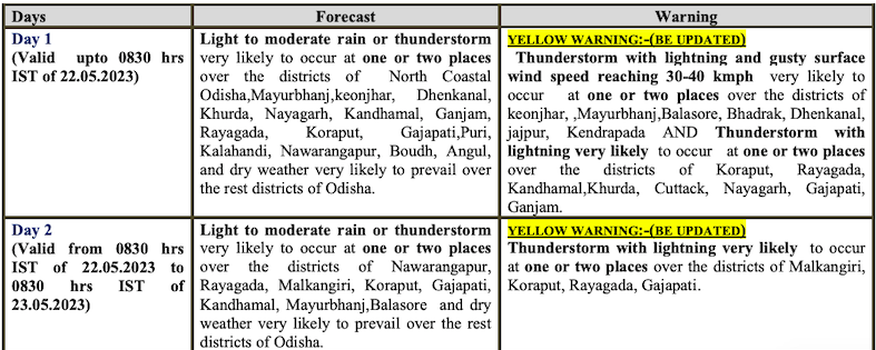 Light to moderate rain or thunderstorm with lightning and gusty surface wind speed reaching 40-50 kmph is likely in Khurda and Puri districts.