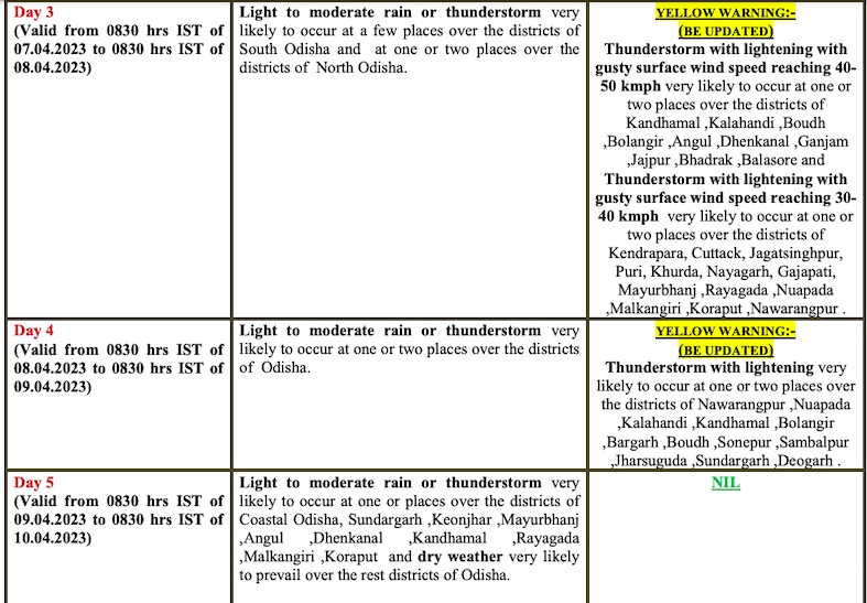 While no warning has been issued for April 3, light to moderate rain or thunderstorm may continue at one or places in coastal Odisha, Sundargarh, Keonjhar, Mayurbhanj, Angul, Dhenkanal, Kandhamal, Rayagada, Malkangiri, Koraput while dry weather is likely to prevail in the remaining districts.