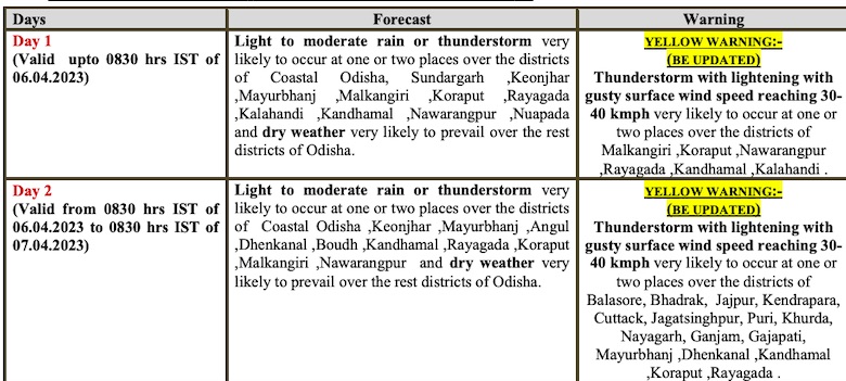 While no warning has been issued for April 3, light to moderate rain or thunderstorm may continue at one or places in coastal Odisha, Sundargarh, Keonjhar, Mayurbhanj, Angul, Dhenkanal, Kandhamal, Rayagada, Malkangiri, Koraput while dry weather is likely to prevail in the remaining districts.