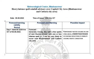 Light to moderate rain/thundershower very likely to occur over parts of Puri, Nayagarh, Cuttack (including Cuttack city), Khurda (including Bhubaneswar), Balasore, Bhadrak, Kendrapara, Jagatsinghpur, Dhenkanal, Keonjhar, Jajpur, Ganjam, Gajapati, Kandhamal, Rayagada, Boudh and Angul districts during the next three hours, according to a nowcast bulletin issued by the India Meteorological Department (IMD)’s regional centre here at 10.15 am on Saturday.