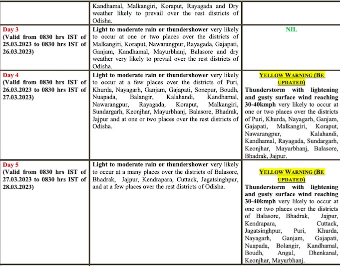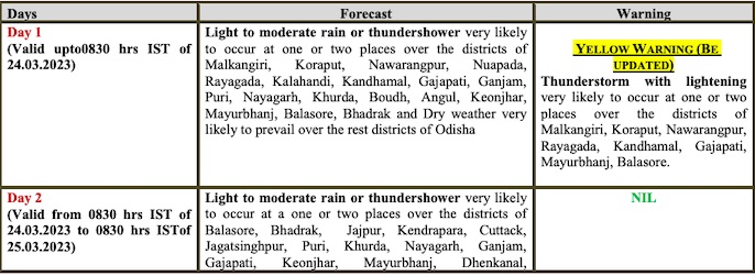 Yellow warning has been issued for some places in Puri, Khurda, Nayagarh, Ganjam, Gajapati, Malkangiri, Koraput, Nabarangpur, Kalahandi, Kandhamal, Rayagada, Sundargarh, Keonjhar, Mayurbhanj, Balasore, Bhadrak and Jajpur on March 26. Light to moderate rain or thundershower is also likely at a few places in Puri, Khurda, Nayagarh, Ganjam, Gajapati, Sonepur, Boudh, Nuapada, Balangir, Kalahandi, Kandhamal, Nabarangpur, Rayagada, Koraput, Malkangiri, Sundargarh, Keonjhar, Mayurbhanj, Balasore, Bhadrak and Jajpur and at one or two places in the rest of the state during this period.