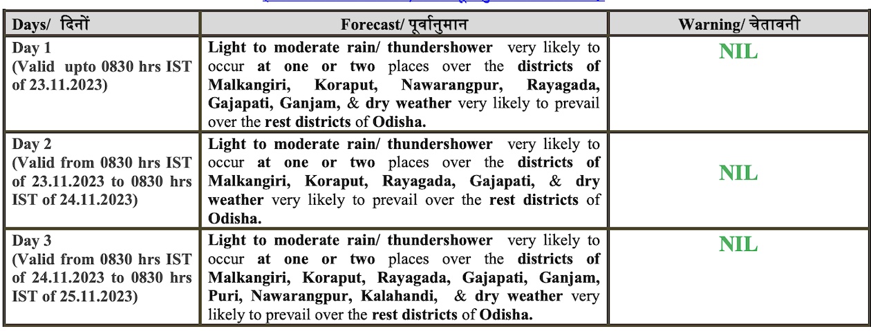 RAIN FORECAST FOR ODISHA Till NOVEMBER 24