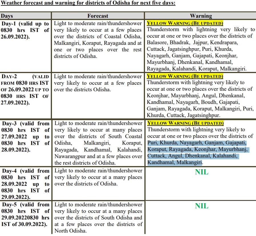 The same warning has been issued for Keonjhar, Mayurbhanj, Angul, Dhenkanal, Kandhamal, Nayagarh, Boudh, Gajapati, Ganjam, Rayagada, Koraput, Malkangiri, Puri, Khurda, Cuttack, Jagatsinghpur districts from 8.30 am on September 26 till 8.30 am on September 27 and for Puri, Khurda, Nayagarh, Ganjam, Gajapati, Koraput, Rayagada, Keonjhar, Mayurbhanj, Cuttack, Angul, Dhenkanal, Kalahandi, Kandhamal, Malkangiri districts from 8.30 am on September 27 till 8.30 am on September 28.