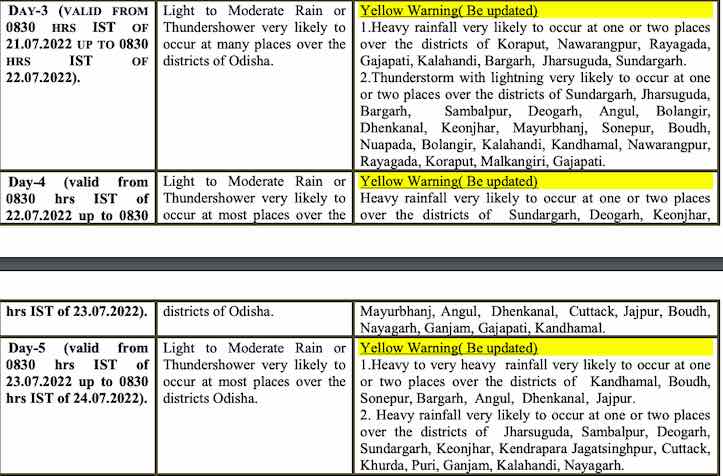 The IMD had earlier said that Odisha is likely to experience heavy rainfall again from July 21 and issued yellow warning for three days.