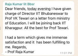 The outgoing director, IIT-Bhubaneswar Prof RV Raja Kumar handed over the charge to Prof Tiwari on Saturday evening. Prof Kumar, in a tweet, said, “I have given charge of director, IIT Bhubaneswar to Prof VK Tiwari on a letter from Ministry of Education. I will be joining back IIT Kharagpur.”