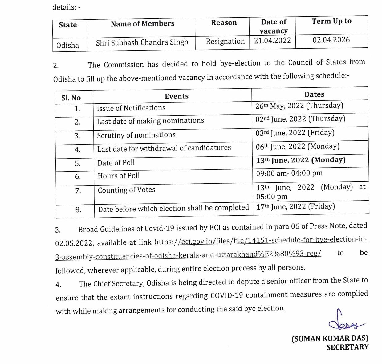 Bhubaneswar: The by-election to Rajya Sabha seat from Odisha will be held on June 13. The Election Commission of India (ECI) has issued notification in this regard on Friday.