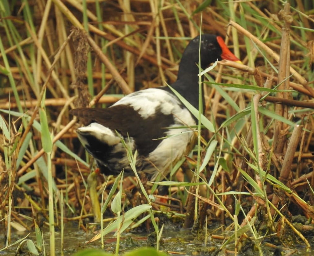 Notably, a normal colored Common Moorhen as per ebird.org, has “Big white oval patches under tail and white streaks along flanks. Adult has red bill with yellow tip and immature has duller bill and legs, said Subhendu.