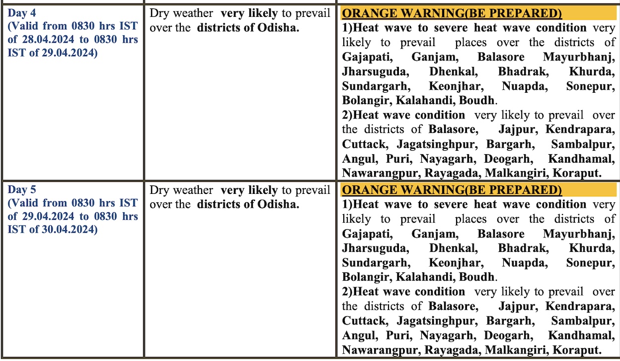 Red warning has also been issued for several districts on April 26-27. “While the mercury is expected to rise by 2-4°C at many places in Odisha during the next 3 to 4 days, the day temperature may remain at 40°C or above in coastal districts of the state due to prevailing northwesterly to westerly dry air and high solar insolation,” according to the midday bulletin.