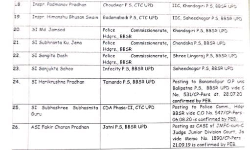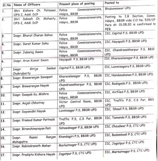“The Establishment Board of the Police Commissionerate, Bhubaneswar-Cuttack, has decided the transfers keeping in view of the vacancy position, administrative requirement, workload and interest of public service,” the order said.