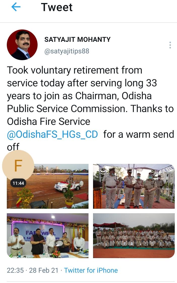 The 1988-batch IPS officer was given a farewell by Odisha Fire Service at Naraj in Cuttack. He joined a valedictory function at the Odisha Police Training Academy in Bhubaneswar later in the day.