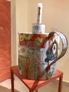 She has made a kerosene lamp (dibiri) with galvanised sheet and acrylic colour. Here dibiri symbolizes evolution and progress. “But development activities have led to problems of large-scale deforestation and increasing volume of traffic, pollution and temperature rise etc,” said Priyadarshini.