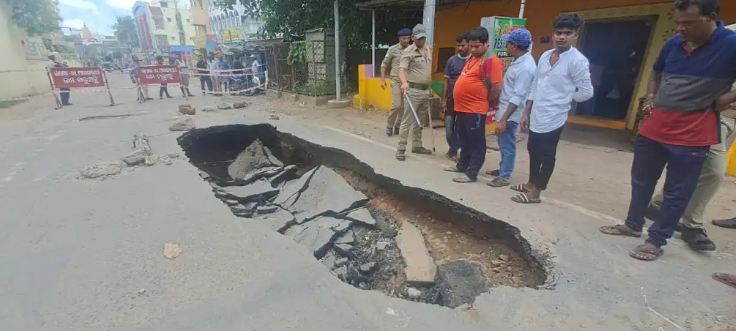 Puri: A portion of an important road caved in at Chakratirtha in Odisha’s seaside pilgrim town of Puri, causing inconvenience and posing danger to the public.