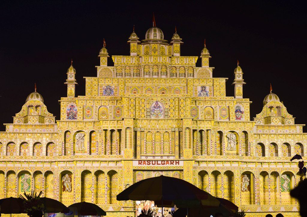 The pandal of Rasulgarh puja is a replica of the Royal Albert Hall of London. A plethora of artificial gemstones are glittering in the yellow background of the pandal.