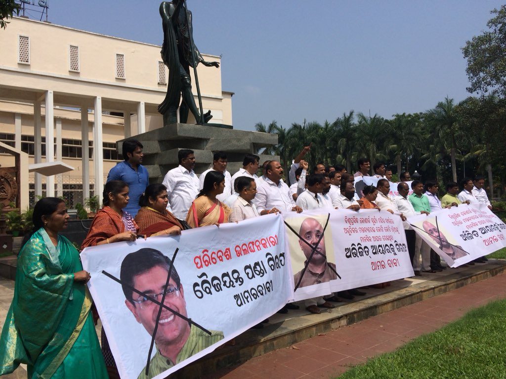 Demanding the arrest of the journalist for uploading his statement and the video on the social media, the BJD members staged a dharna in the well of the House and later under the Mahatma Gandhi statue inside the Assembly.