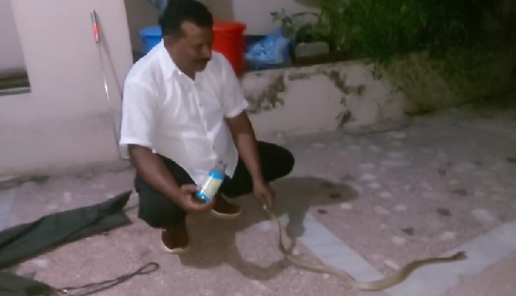 Dillip Khatei, a resident of Jamukoli on the outskirts of Bhubaneswar, spotted the cobra in his backyard. On closer inspection, he found that the snake was unable to move as its head was stuck inside the glass bottle and called the Snake Helpline to rescue the snake.