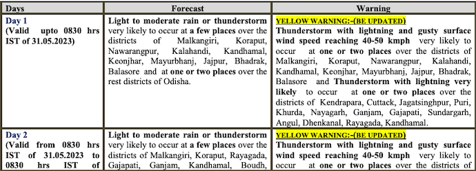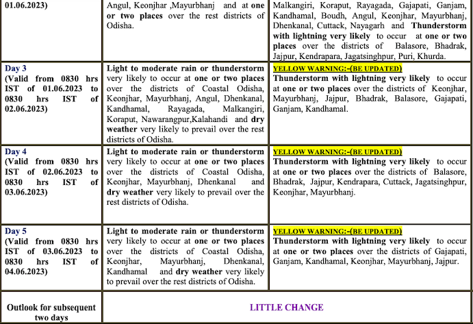 There is also a yellow warning for thunderstorm with lightning and gusty surface wind speed reaching 40-50 kmph for some districts for two days. Warning for thunderstorm with lightning continues till June 3 while the MeT office has also predicted rain at some places during this period.