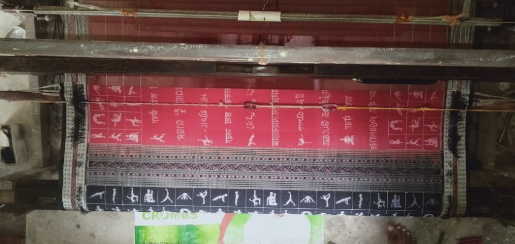 Sonepur: The message, ‘Yoga is Life’, in 10 languages, including Odia, Hindi, English and Urdu, along with 12 poses of Surya Namaskar intricately weaved into a Sambalpuri Bandha Saree from Odisha is grabbing headlines on International Yoga Day again.