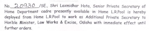 “…. Senior Private Secretary of the Home Department cadre is hereby posted as Additional Private Secretary to Chief Minister, Odisha, with immediate effect until further orders,” it said.