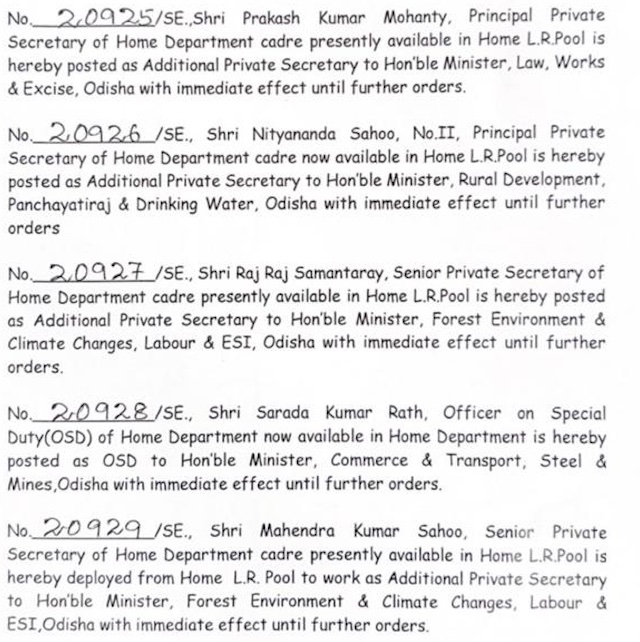 Senior Odisha Secretariat Service (OSS) officer Binod Bihari Singh too has been deployed in the office of the CM. Singh was serving as an Under Secretary in the Planning & Convergence Department. Keonjhar sub-collector Trilochan Mohanty has also been transferred and posted as joint secretary to CM Majhi.