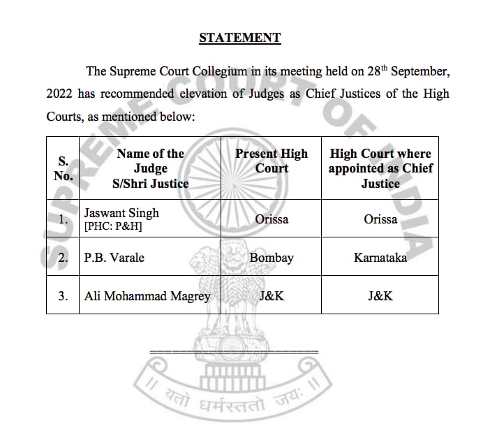 New Delhi: The Supreme Court Collegium has recommended the elevation of Justice Jaswant Singh as Chief Justice (CJ) of Orissa High Court.