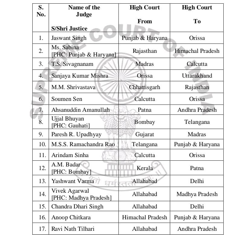 It has also recommended the transfer of Justice Jaswant Singh, Judge, Punjab & Haryana HC, and Justices Soumen Sen and Justice Arindam Sinha of Calcutta HC, to Orissa HC.