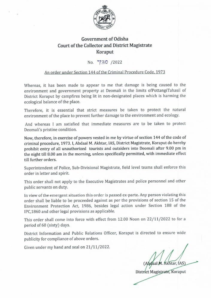 Koraput: The district administration has imposed Section 144 of CrPC at Deomali hill range in Odisha’s Koraput, prohibiting entry of all unauthorised tourists and outsiders into the area from 9 pm to 8 am unless specifically permitted.