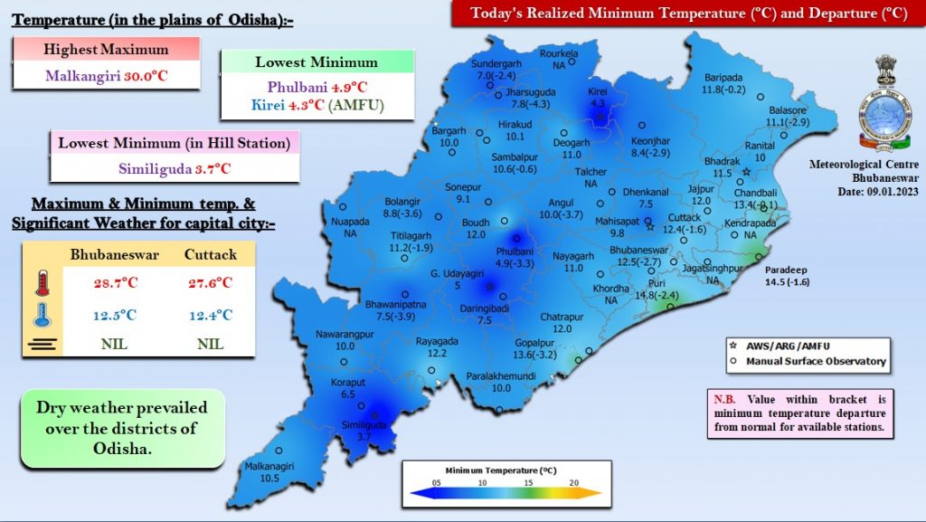 The twin cities of Bhubaneswar and Cuttack recorded 12.5 degree Celsius and 12.4 degree Celsius respectively.
