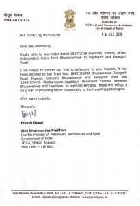 Thank Shri @PiyushGoyal ji for acceding to my request for running Train no. 18437/18438 Bhubaneswar-Junagarh Road Express between Bhubaneswar & Junagarh Road and Train no 18447/18448 Bhubaneswar-Jagdalpur Hirakhand Express between Bhubaneswar and Jagdalpur, as separate services.