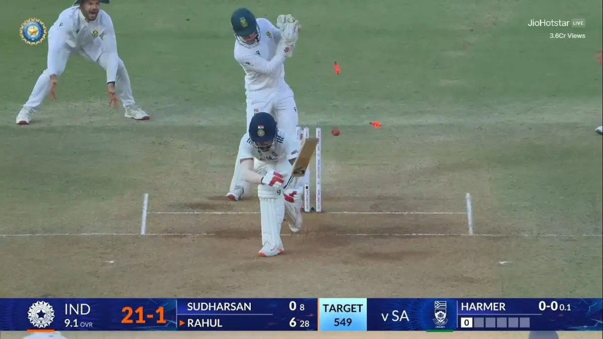 Rahul tried to play a lazy flick only to be castled by a sharply spinning delivery from off-spinner Simon Harmer.