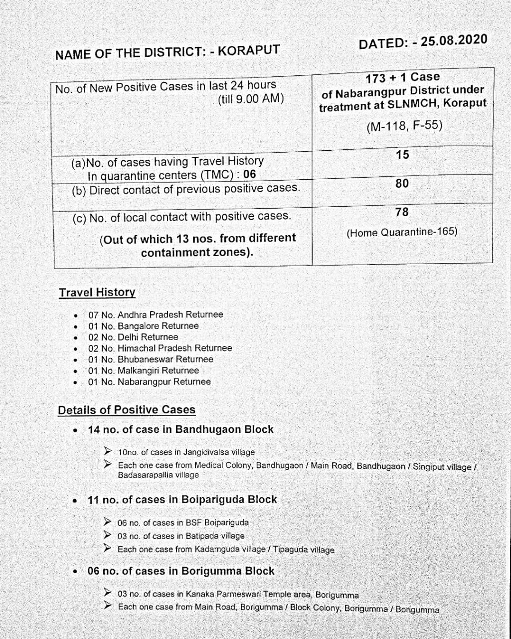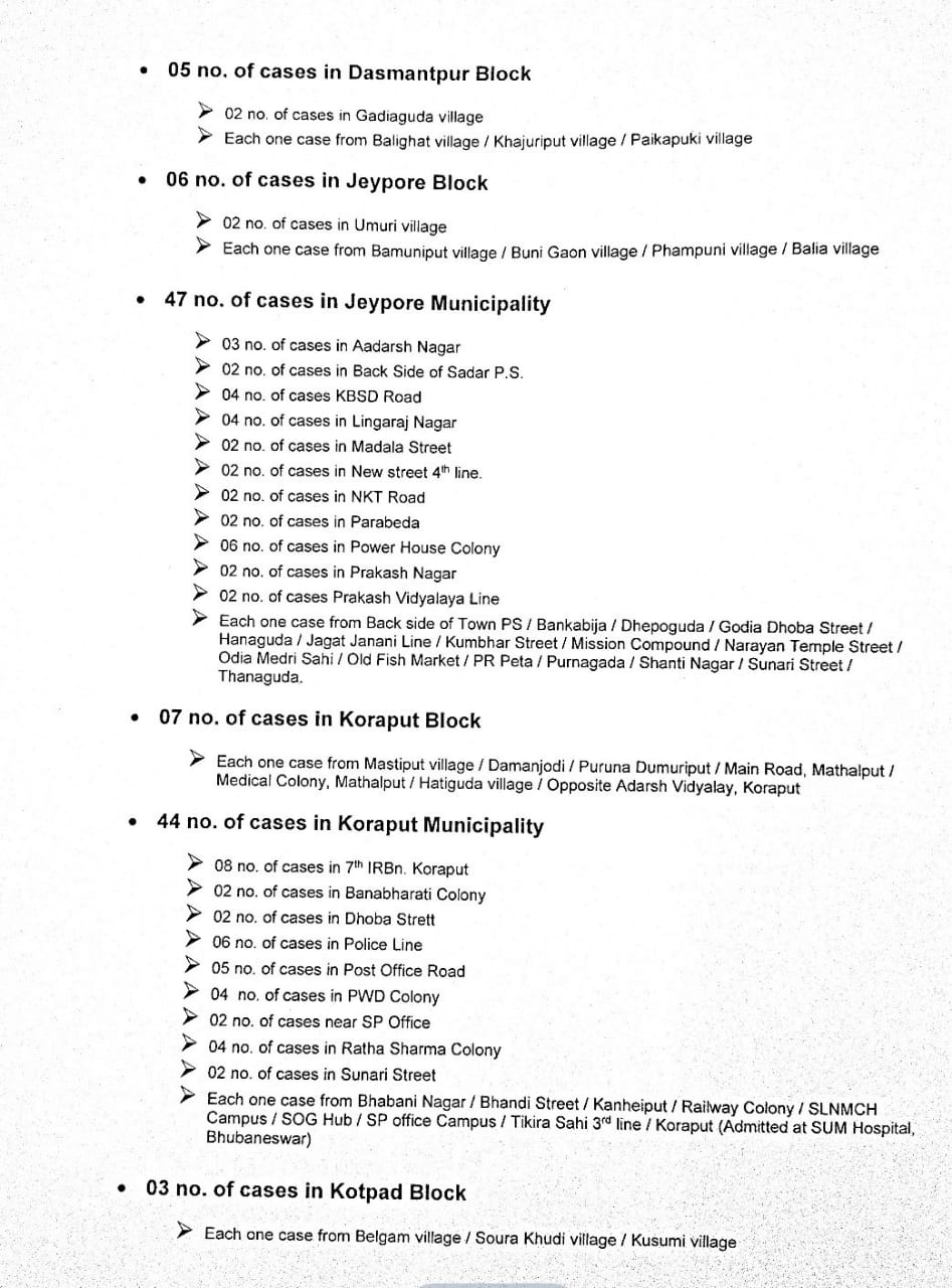 The highest of 47 were reported from Jeypore municipality, followed by 44 from Koraput municipality, 14 from Bandhugaon block, 11 from Boipariguda block, 10 from Sunabeda municipality, seven from Koraput block, six each from Jeypore and Borigumma block, five from Dasmantapur block, four each from Kundra and Narayanpatna block, three from Kotpad block, two each from Kotpad NAC, Lamptaput, Laxmipur, Nandapur, Pottangi, and Semiliguda block.