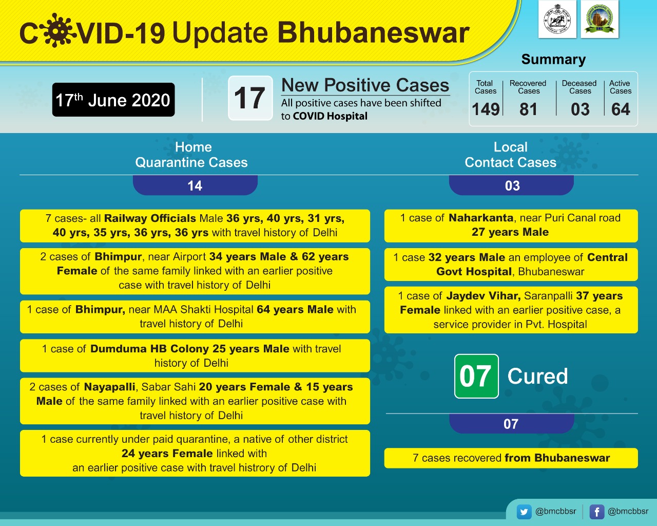 According to Bhubaneswar Municipal Corporation, 14 among the total 17 patients have been in home quarantine while three are local contacts.