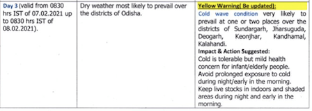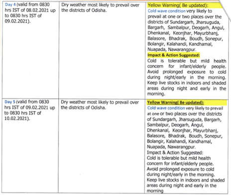 Bhubaneswar: The India Meteorological Centre (IMD) here has issued yellow warning with isolated to severe cold wave conditions likely to sweep 18 districts of Odisha from February 7 to 10.