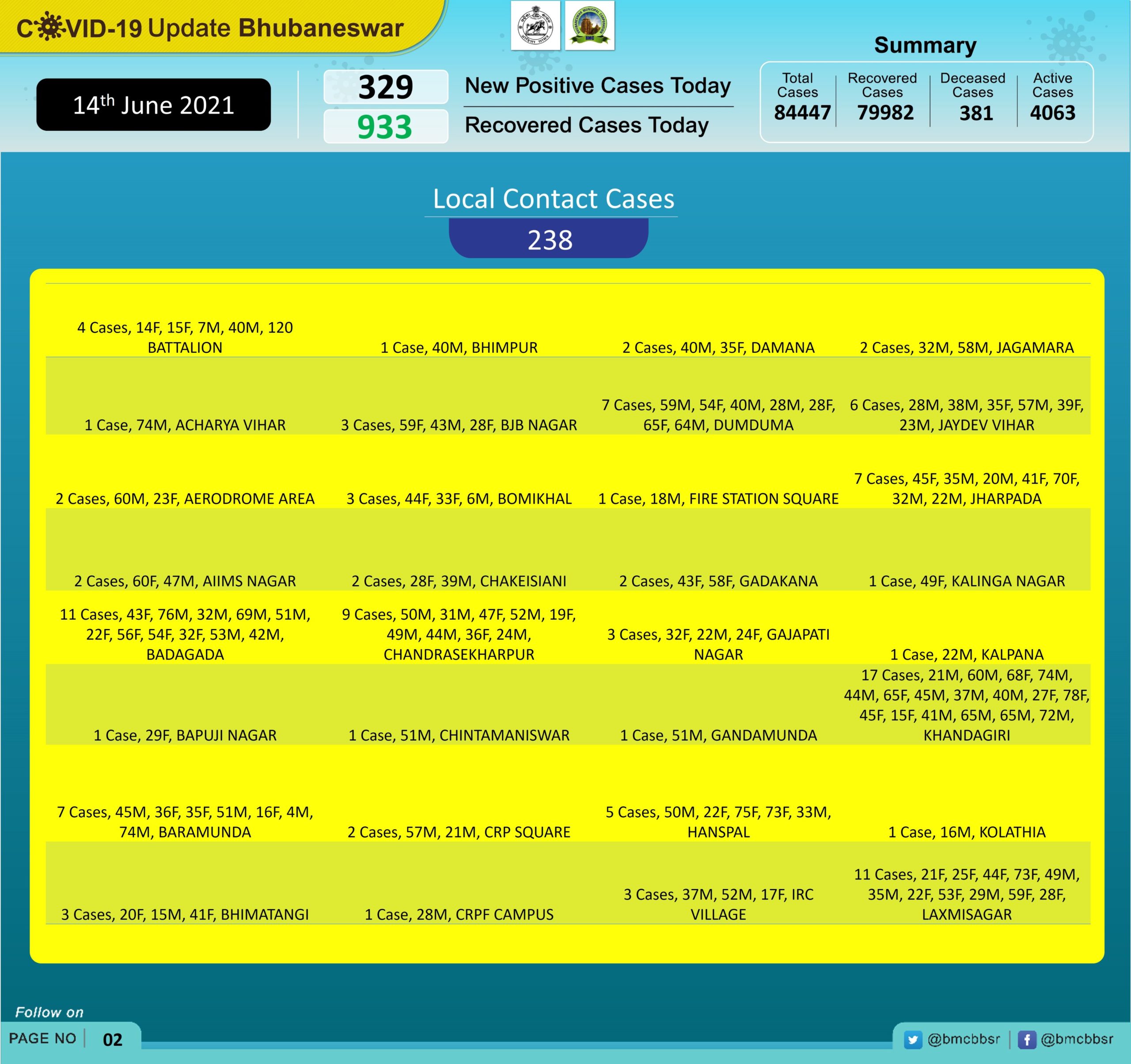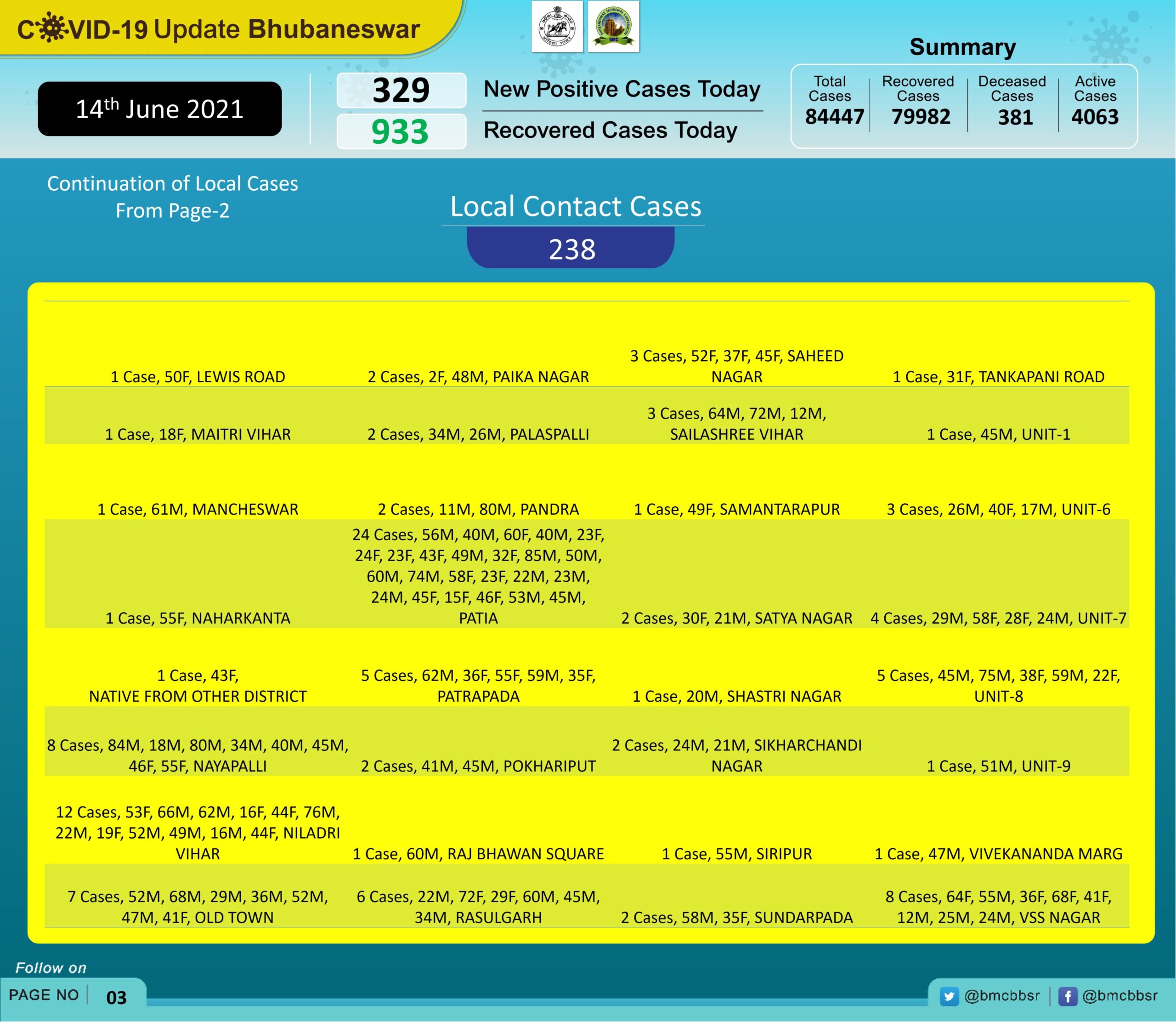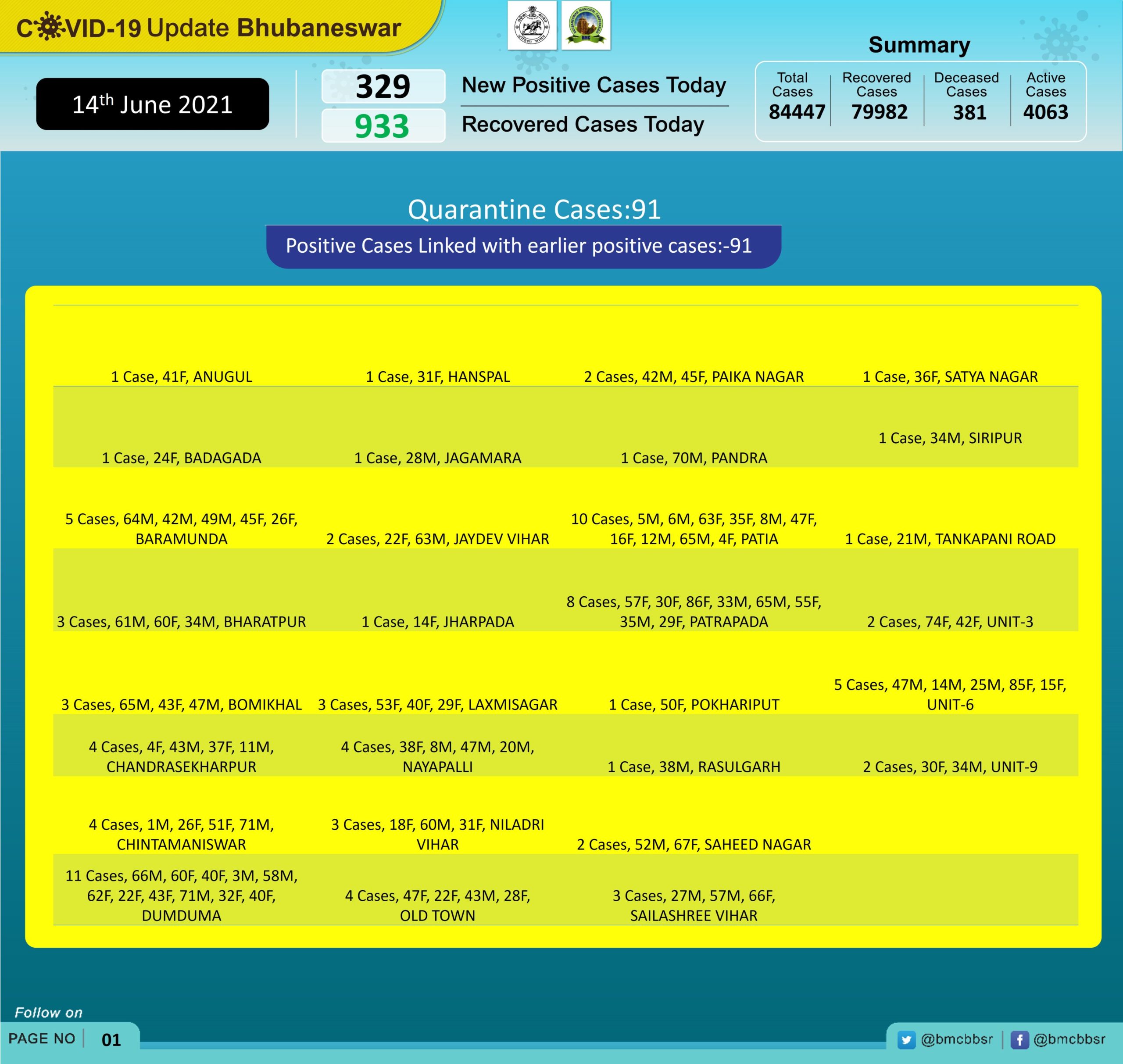 Among new cases, 91 are from quarantine and 238 through local contacts. The total number of cases in Bhubaneswar has now gone up to 84,447.