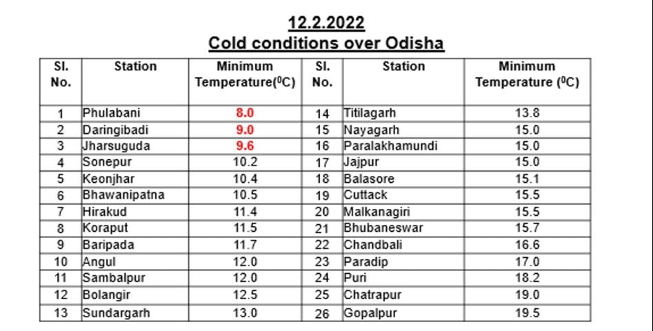 G Udaygiri recorded 8.6 degree Celsius followed by Daringbadi at 9 degree Celsius and Jharsuguda at 9.6 degree Celsius.